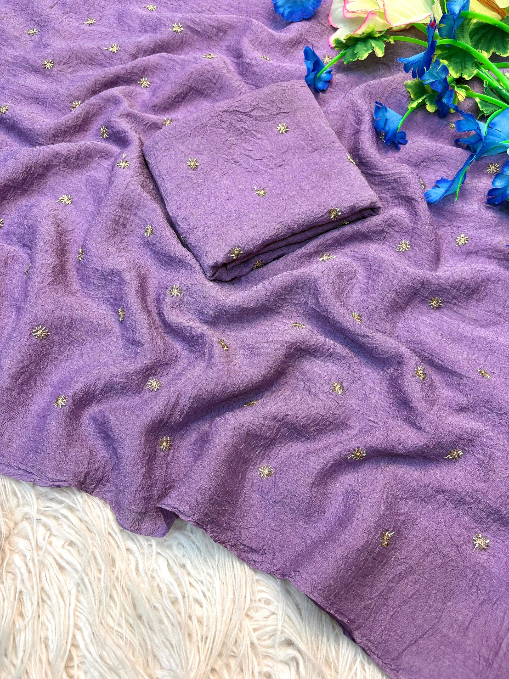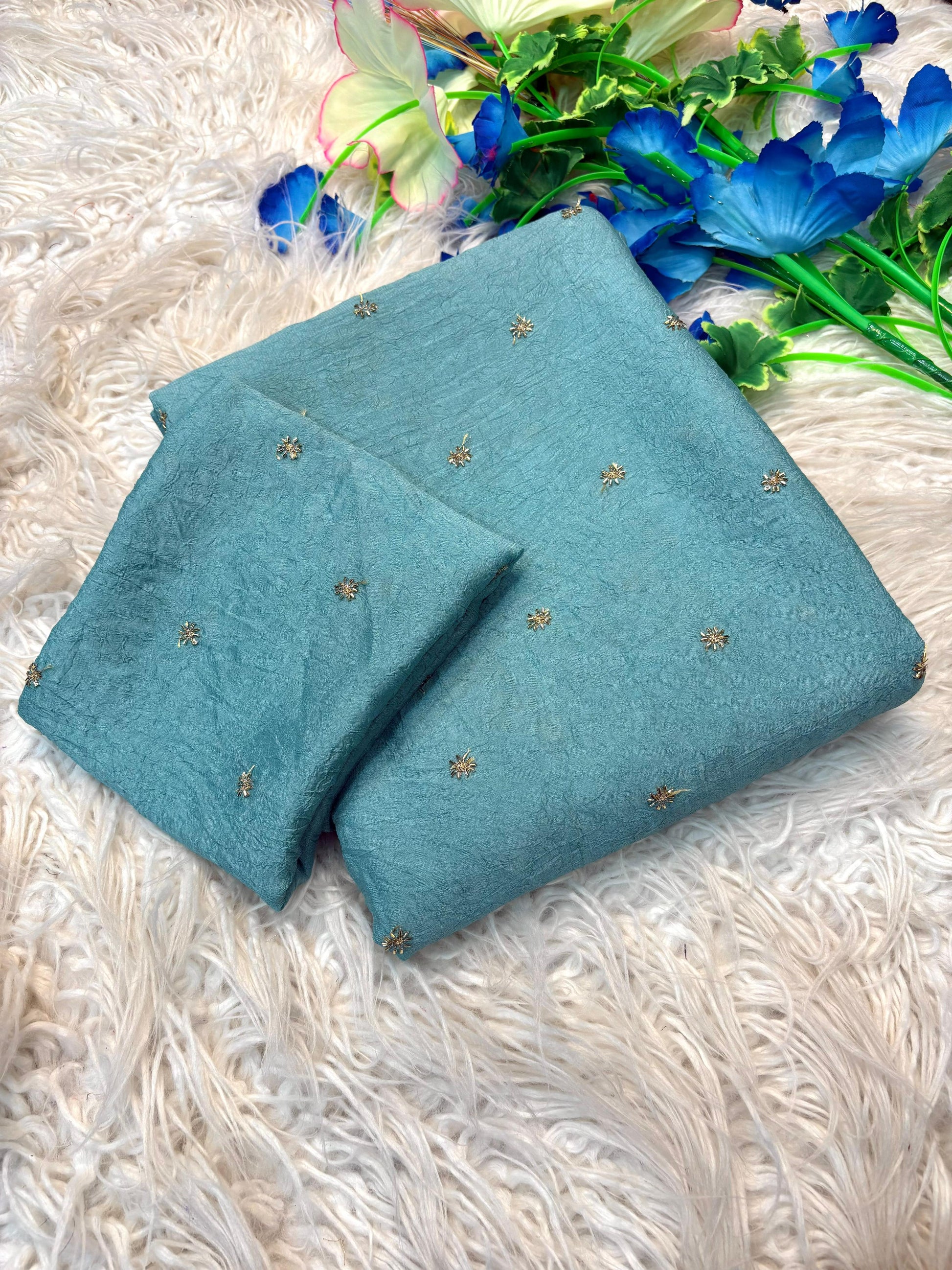 Beautiful Rangoli crush fabric saree featuring elegant all-over beads work design for a rich and graceful look. Comes with a matching running blouse piece in the same fabric with work. Perfect for festive wear, parties, and special occasions. Lightweight, stylish, and easy to carry. 💫