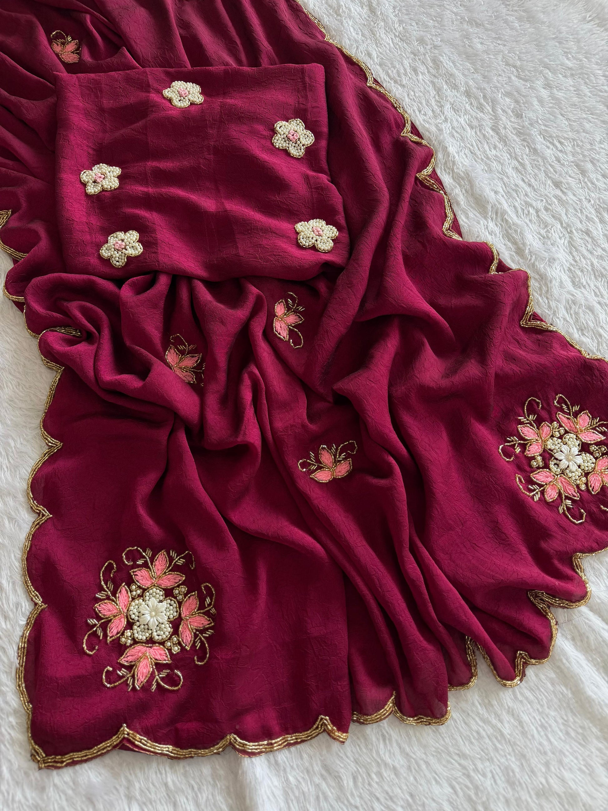 Soft crush rangoli saree with beautiful handwork all over and running blouse with handwork