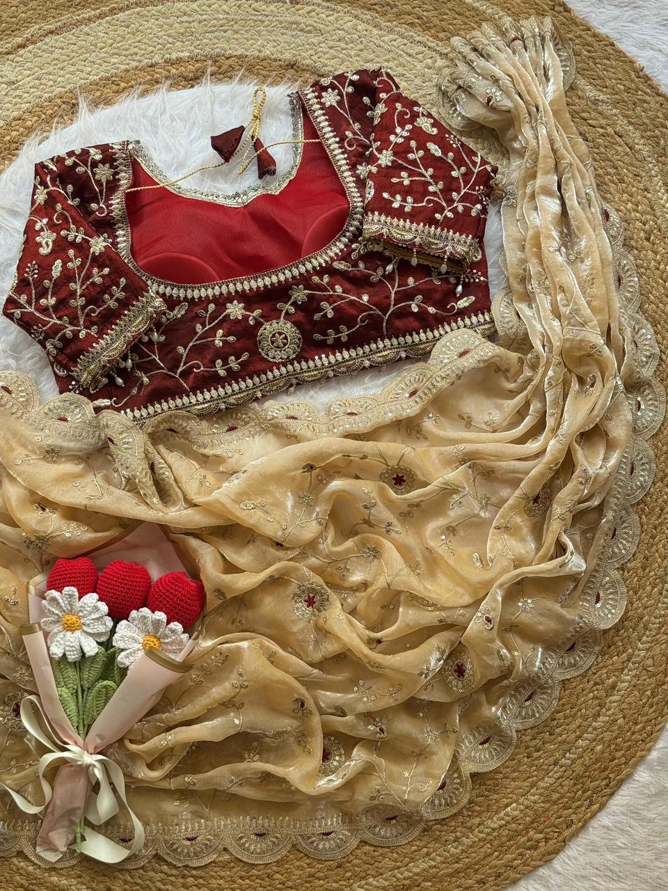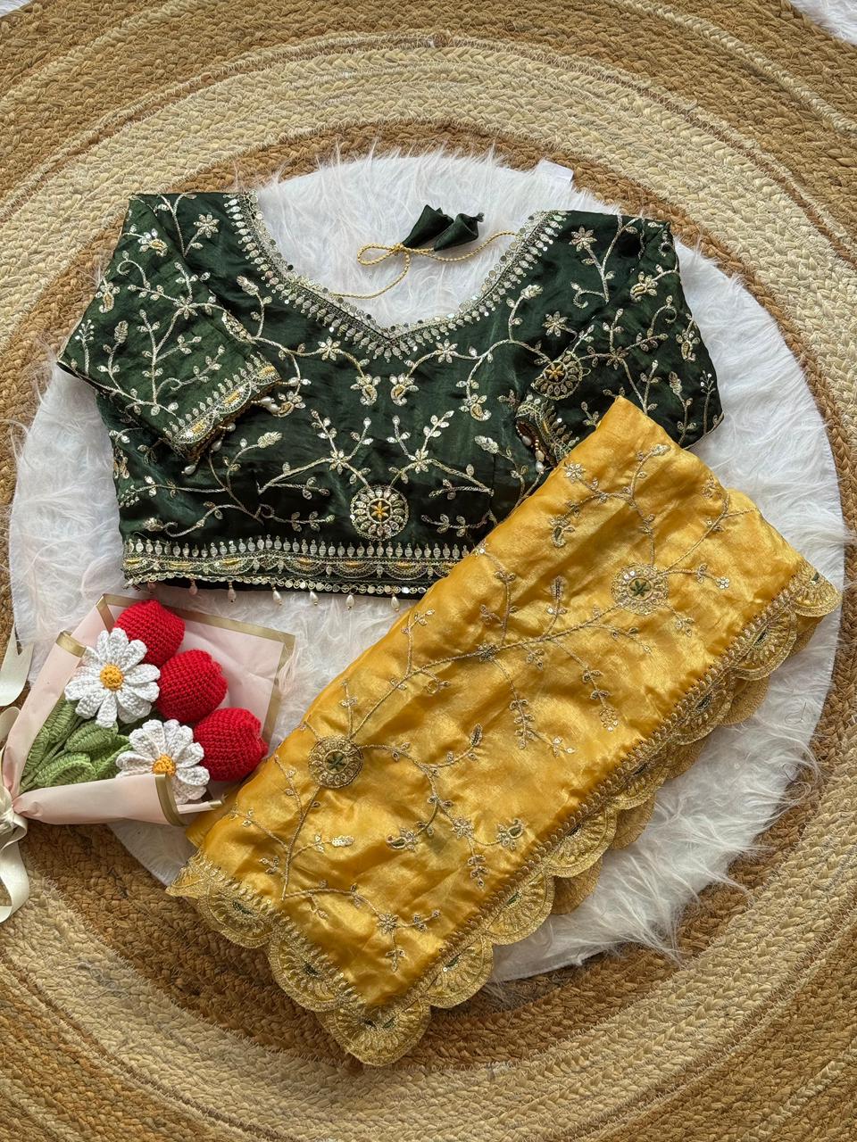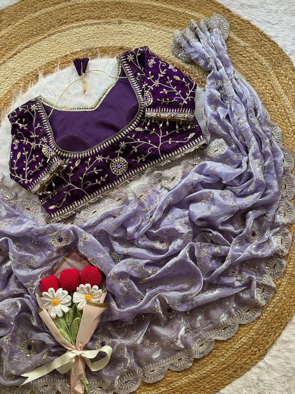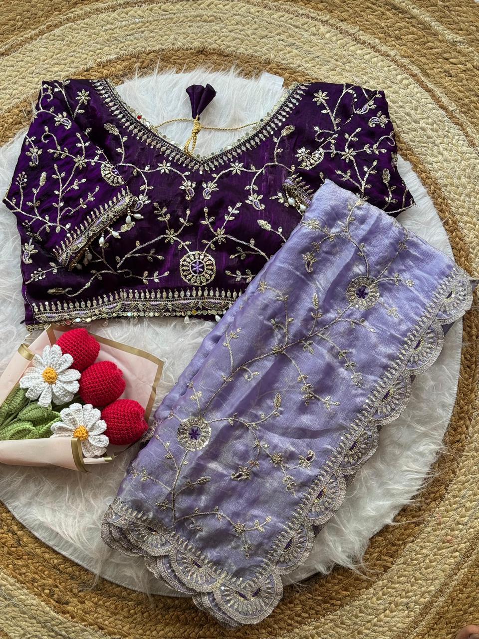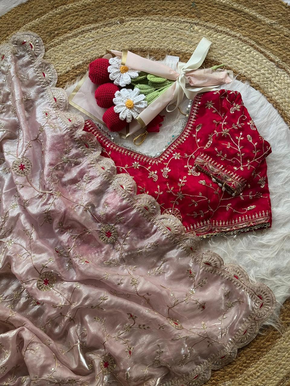 Soft space silk saree with embroidery sequence work all over and cutwork border