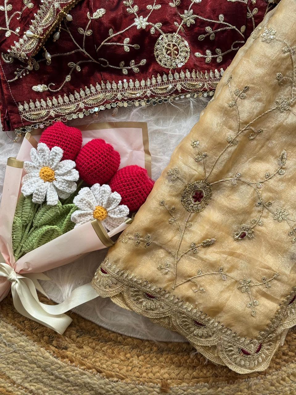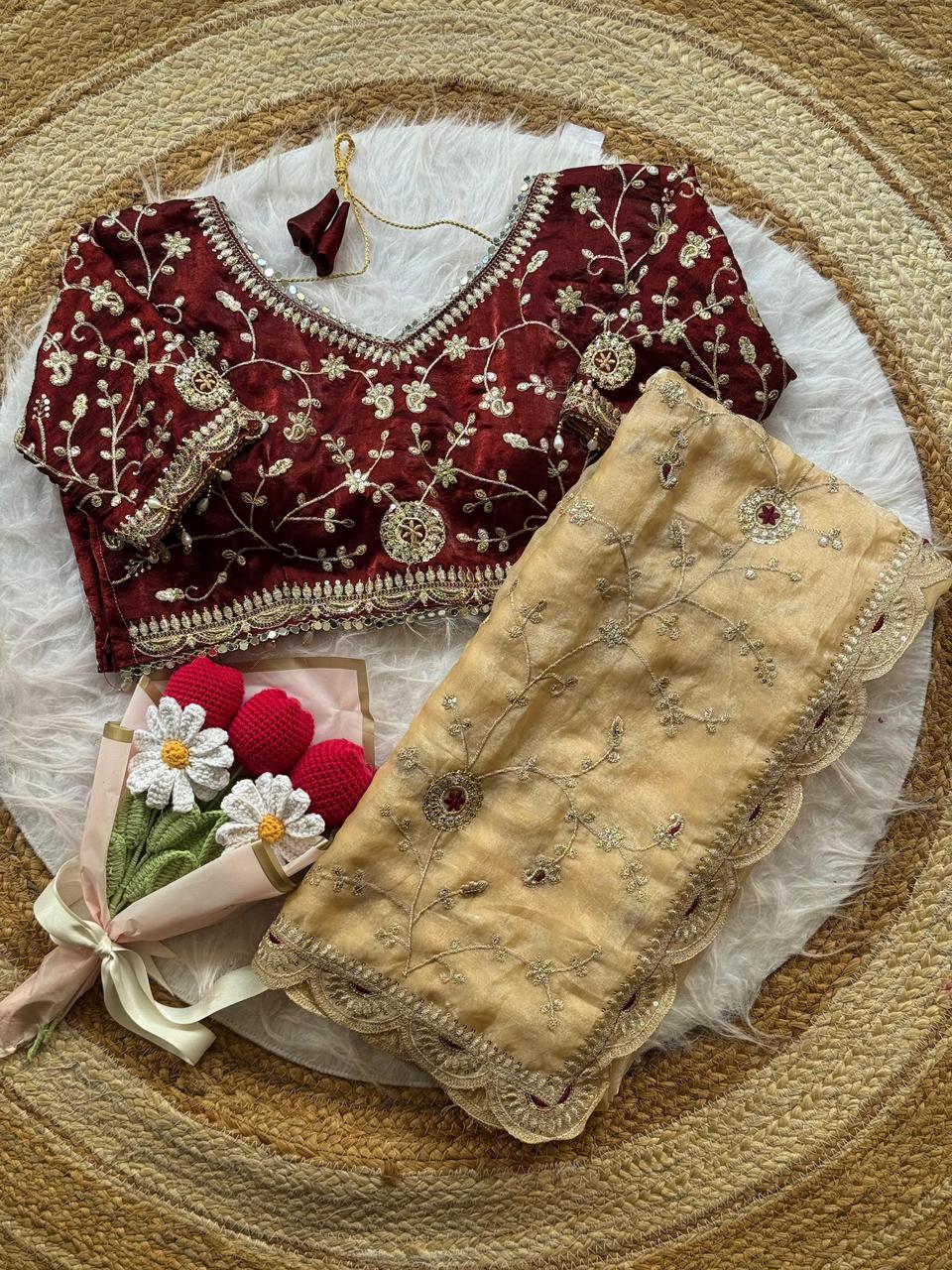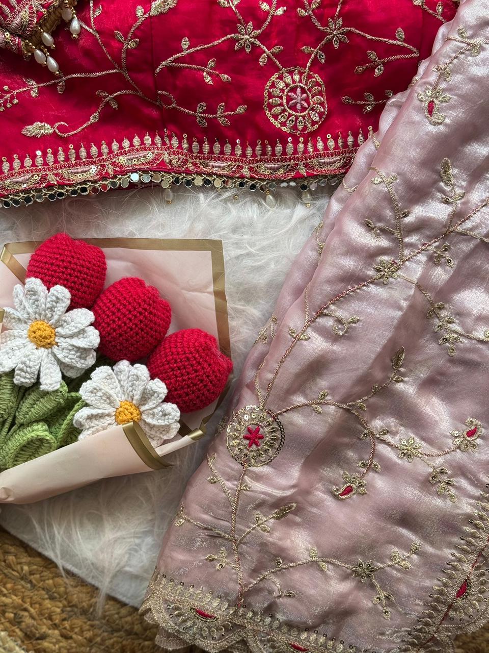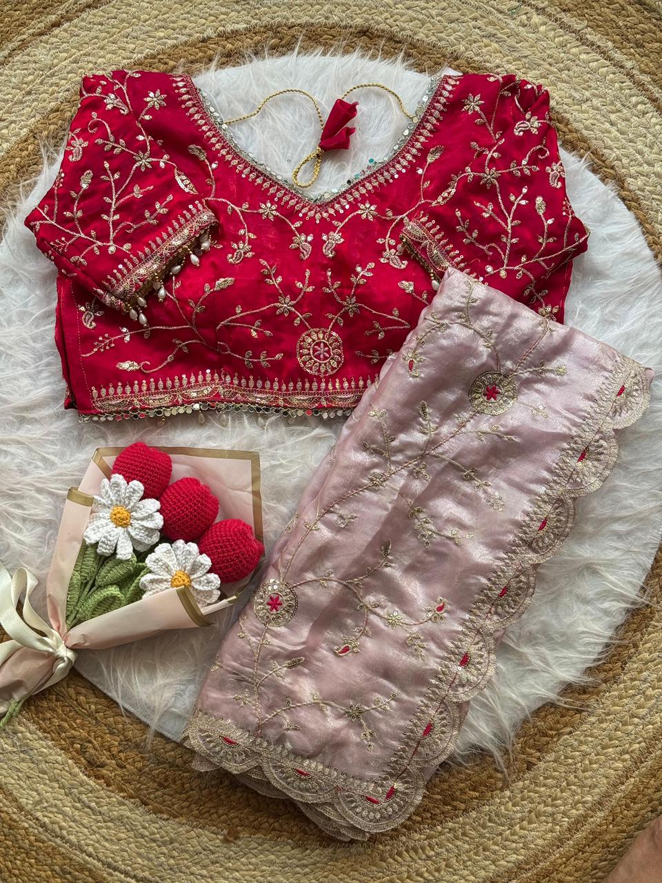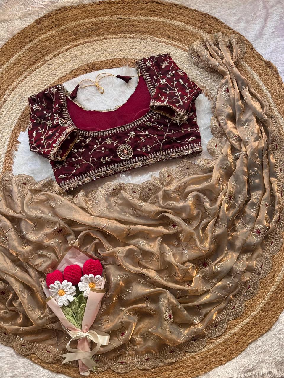 Soft space silk saree with embroidery sequence work all over and cutwork border