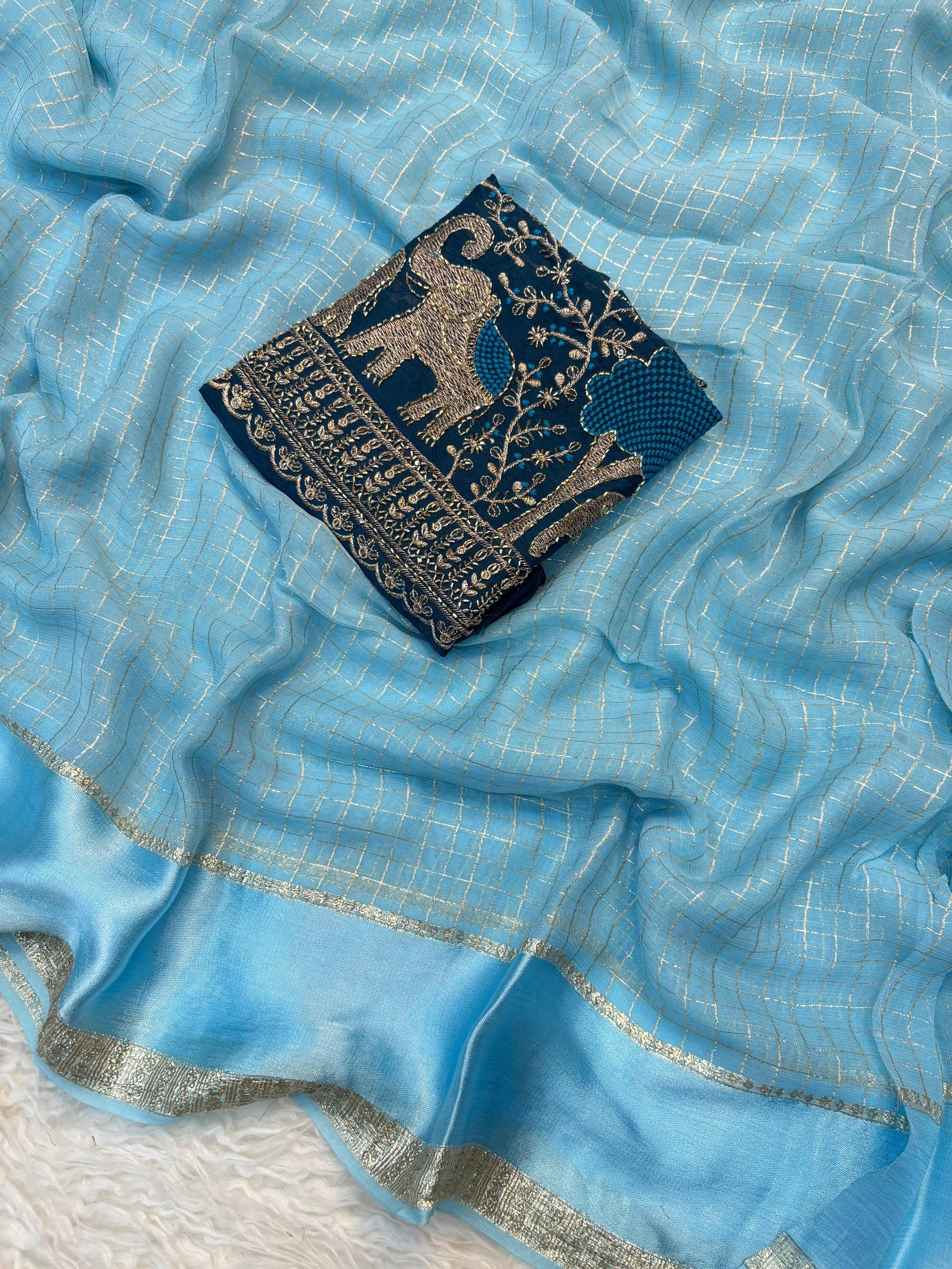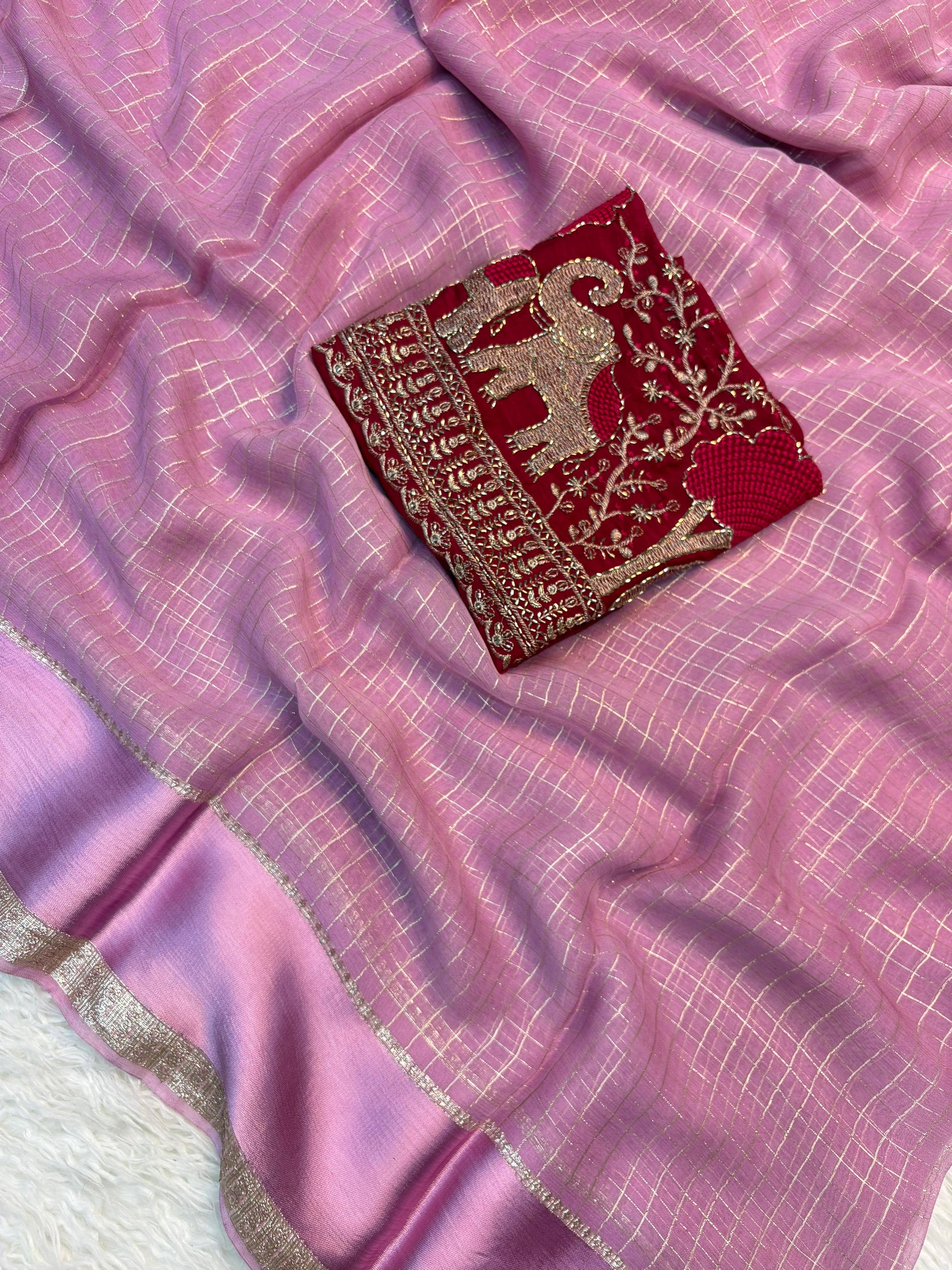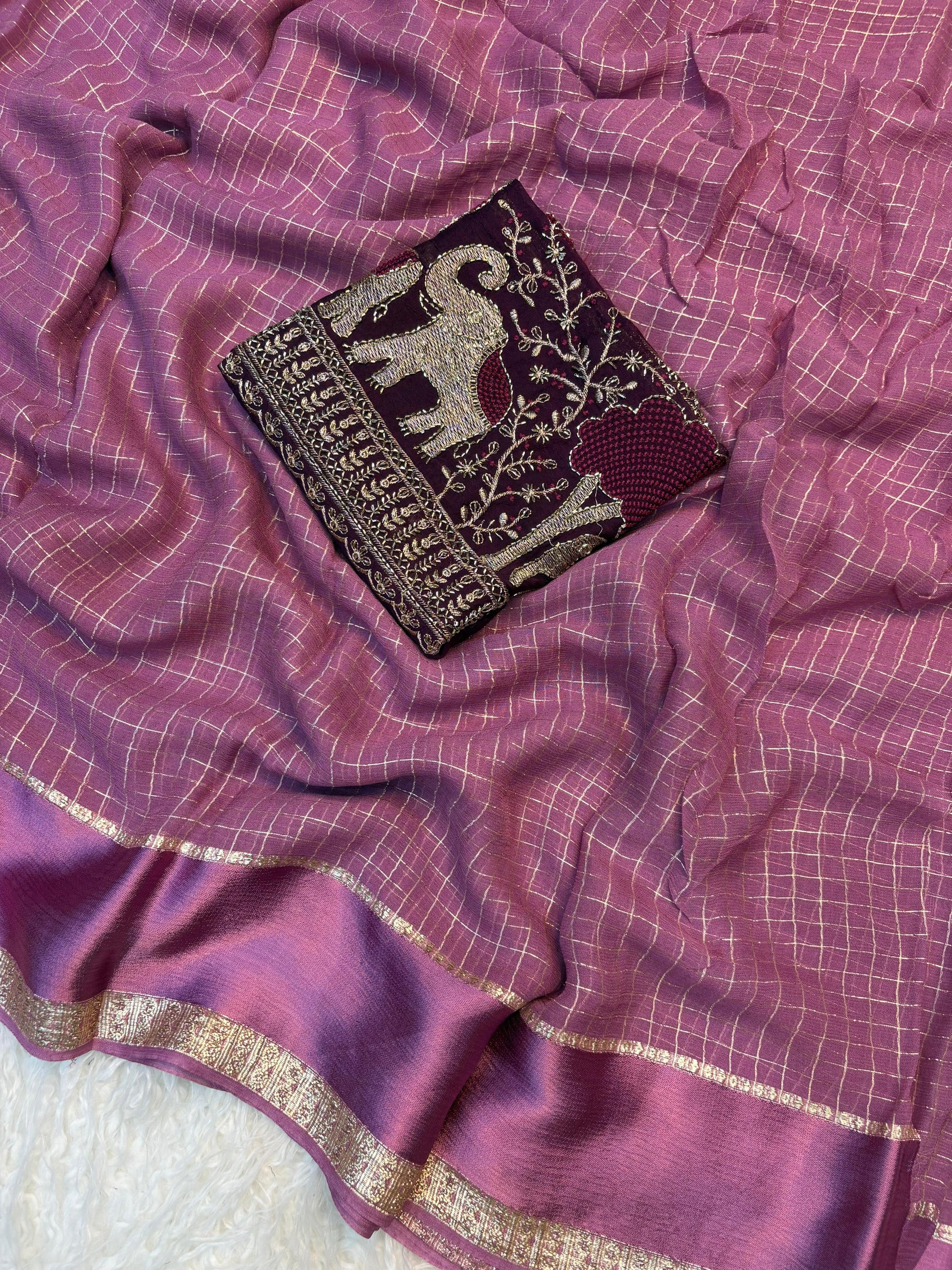 Fabric:Pure Viscose Georgette with weaving checks and satin border